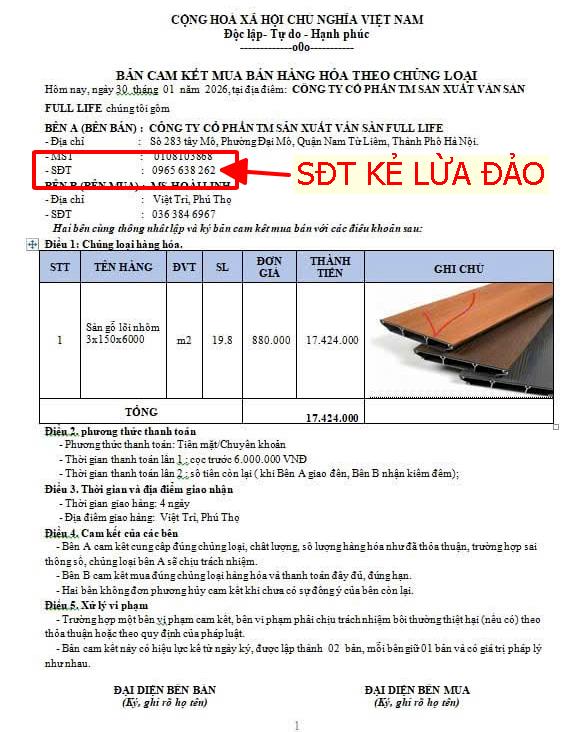 🚨 CẢNH BÁO KHẨN CẤP: HÀNH VI GIẢ MẠO CÔNG TY CỔ PHẦN THƯƠNG MẠI SẢN XUẤT VÁN SÀN FULL LIFE ĐỂ TRỤC LỢI
