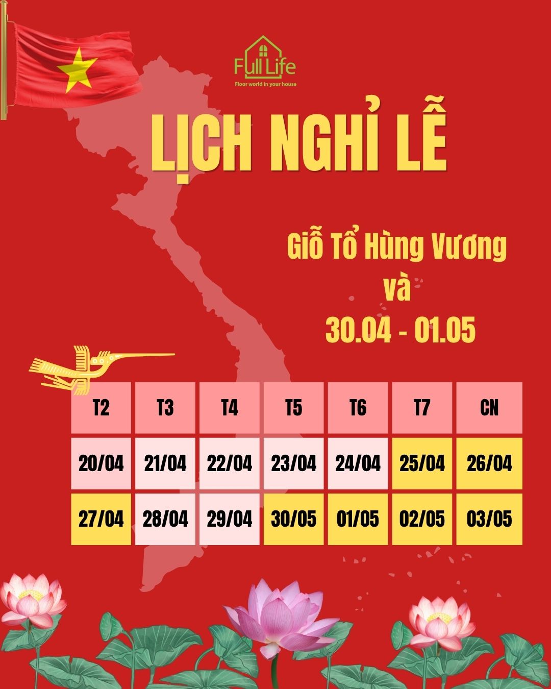 Full Life xin cảm ơn Quý khách hàng đã luôn đồng hành và ủng hộ Full Life trong suốt thời gian qua. Nhân dịp giỗ tổ Hùng Vương & 30/4 – 1/5 năm 2026, Full Life Kính chúc Quý khách hàng có kỳ nghỉ lễ vui vẻ bên gia đình